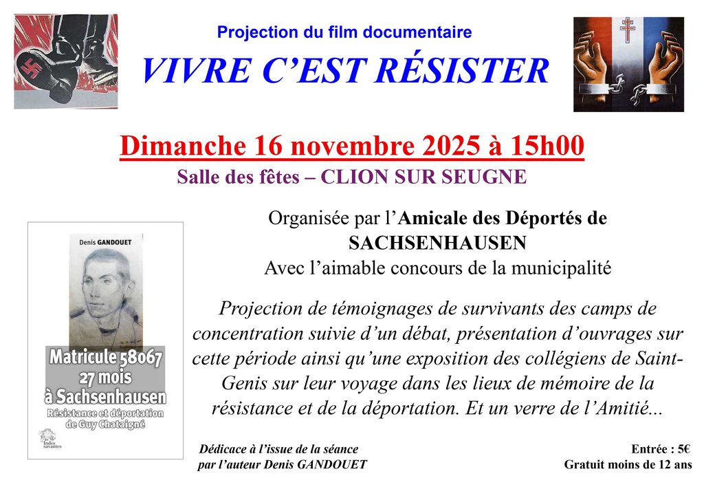 L'Amicale des Déportés de Sachsenhausen organise la projection du film documentaire "VIVRE C'EST RÉSISTER" le dimanche 16 novembre 2025 à 15h à la Salle des Fêtes de Clion-sur-Seugne.