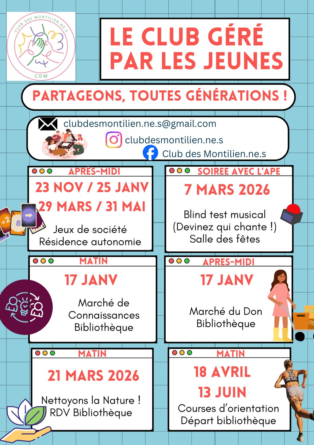 Le Club des Montilien.ne.s organise entre le 17 janvier et le 13 juin 2026 9 événements pour partager des moments de convivialité.