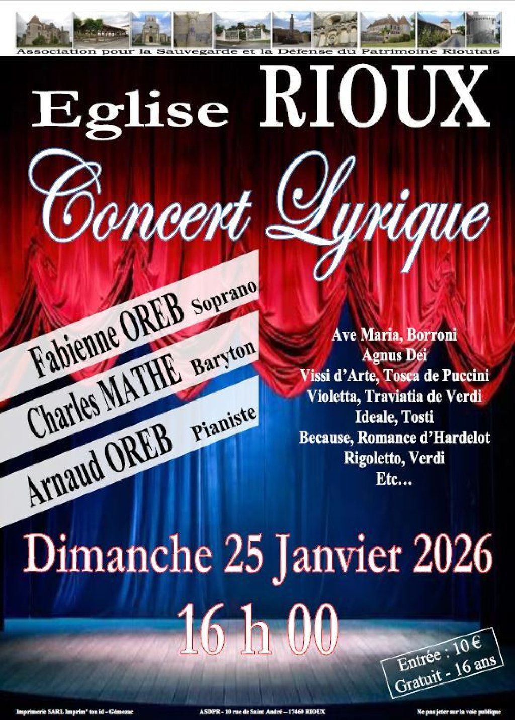 L'ASDPR organise un Concert Lyrique le Dimanche 25 Janvier 2026 à 16h00 à l'Église de Rioux.