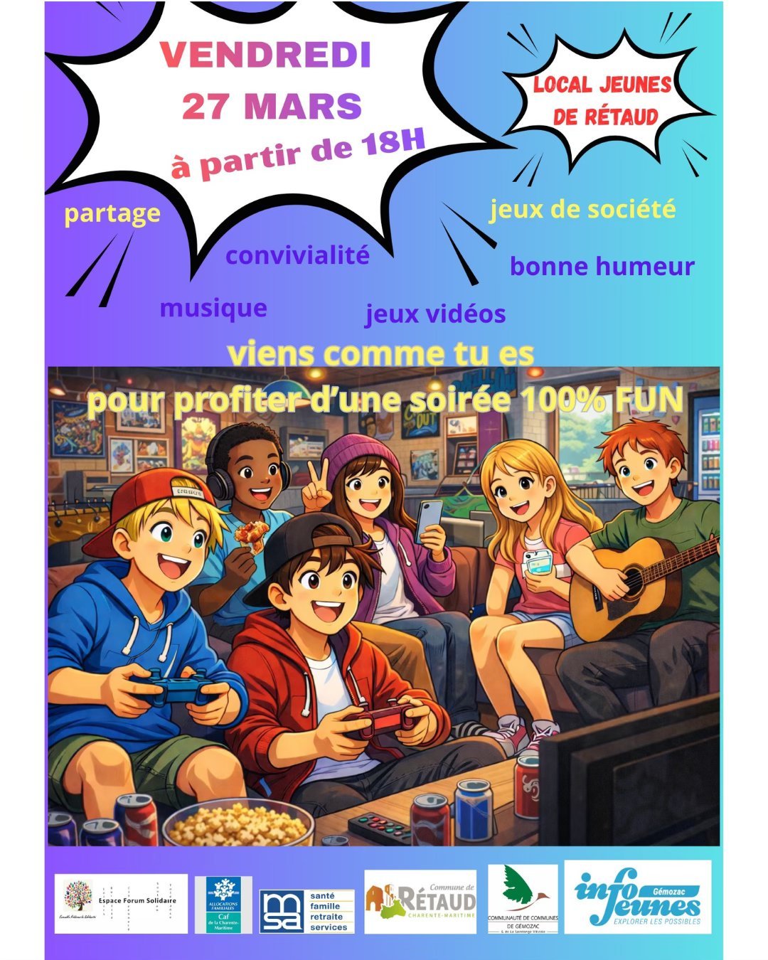 Vendredi 27 mars, à partir de 18H, on se retrouve au Local Jeunes de Rétaud pour une soirée pleine de jeux, musique et bonne ambiance!!