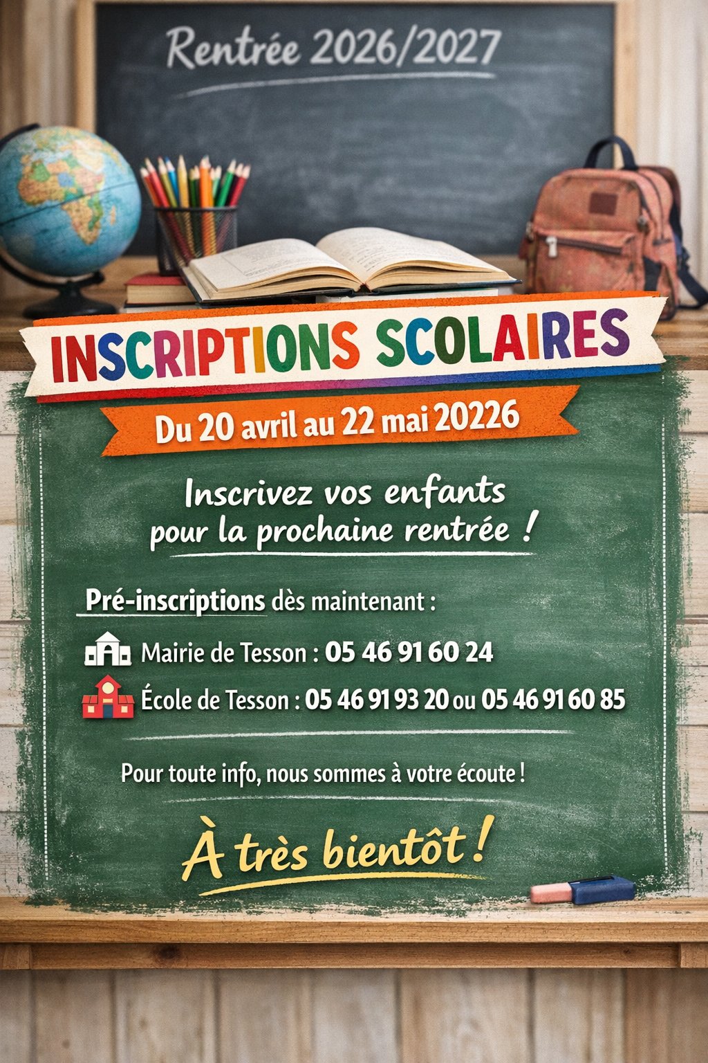 Les inscriptions Ă lâĂ©cole de Tesson seront ouvertes du 20 avril au 22 mai 2026.